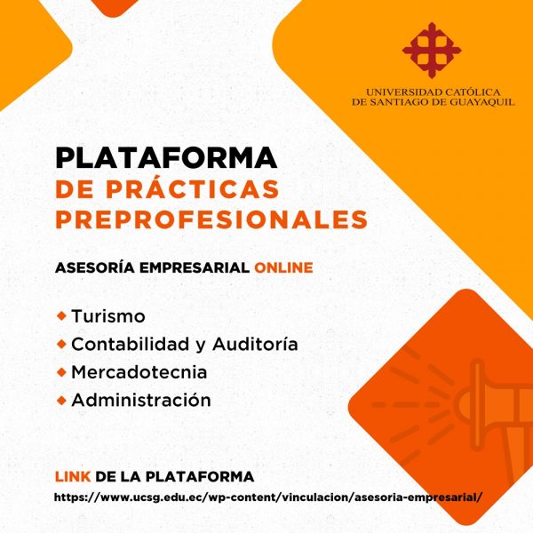 El Vicerrectorado de Vinculación de la Universidad Católica de Santiago de Guayaquil (#UCSG), a partir de este lunes 6 de julio, habilitará la plataforma de Prácticas Preprofesionales. Este es un espacio digital gratuito en el que los usuarios pueden realizar consultas en las áreas de Administración de Empresas, Turismo, Mercadotecnia, Contabilidad y Auditoría que serán resueltas por los estudiantes, guiados por sus docentes.