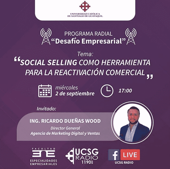 La Facultad de Especialidades Empresariales de la #UCSG te invita a escuchar de su programa en el que tendrán de tema: Social Selling como herramienta para la reactivación comercial”.