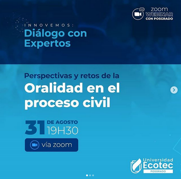La UTPL continúa con el ciclo de Videoconferencias “Innovemos: Diálogo con Expertos”, en este profundizará en el tema de Derecho conociendo las formas viables de comunicación frente a una audiencia y conversarán de “Perspectivas y retos de la Oralidad en el Proceso Civil” con Johnny De La Pared Darquea y Javier Aguirre Valdez, docentes de la Maestría en Derecho Procesal y Bolívar Vergara Coordinador Acádemico de Posgrado, vía Zoom Webinar con Posgrado el lunes 31 de agosto a las 19:30. ¡No te lo pierdas!