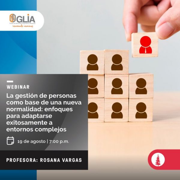 El 19 de agosto a las 19:00 se transmitirá el webinar La gestión de personas como base de una nueva normalidad: enfoques para adaptarse exitosamente a entornos complejos a cargo de la profesora Rosana Vargas. Más información en https://www.glia.edu.ec/producto/design-thinking-para-la-innovacion/