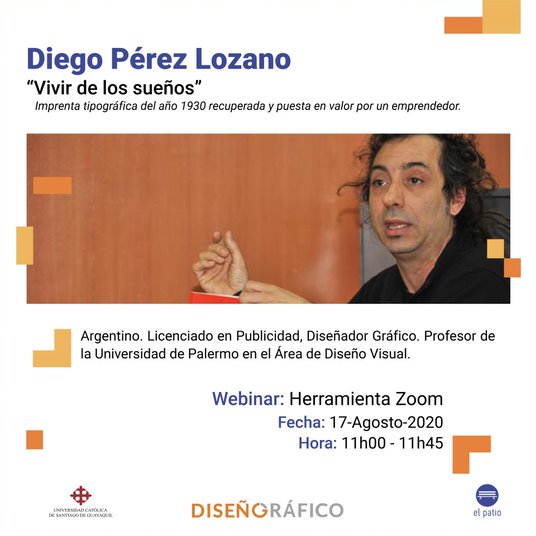 La Carrera de Diseño Gráfico de la Universidad Católica de Santiago de Guayaquil ha organizado la IX edición de El Patio 2020. Espacio de acciones complementarias que permiten la exhibición de propuestas de diseño mediante un proyecto transversal, este 17,18 y 19 de agosto en la plataforma zoom. Contará con la exposición de Diego Pérez Lozano, de la Universidad de Palermo en el área de Diseño Visual. “Vivir de los sueños” Imprenta tipográfica del año 1930 recuperada y puesta en valor por un emprendedor será su charla este lunes 17 de agosto a las 11H00.