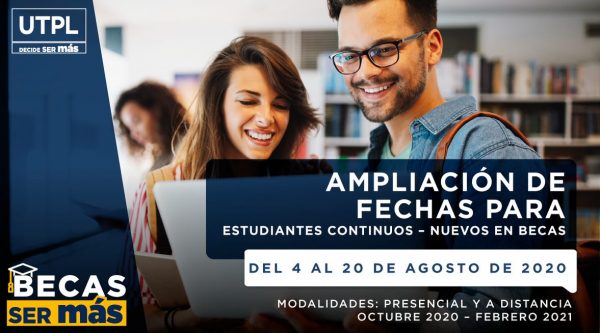 La universidad Técnica Particular de Loja amplio las fechas de postulación para sus Becas ser más, para todos sus estudiantes de 2do ciclo en delante de ambas modalidades hasta el 20 de agosto de 2020. Más información sobre los tipos de becas a los que se puede acceder y postulación en línea en becas.utpl.du.ec