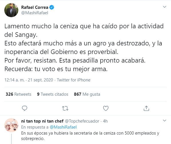 “Lamento mucho la ceniza que ha caído por la actividad del Sangay. Esto afectará mucho más a un agro ya destrozado, y la inoperancia del Gobierno es proverbial. Por favor, resistan. Esta pesadilla pronto acabará. Recuerda: tu voto es tu mejor arma”, escribió el expresidente en su cuenta de Twitter.