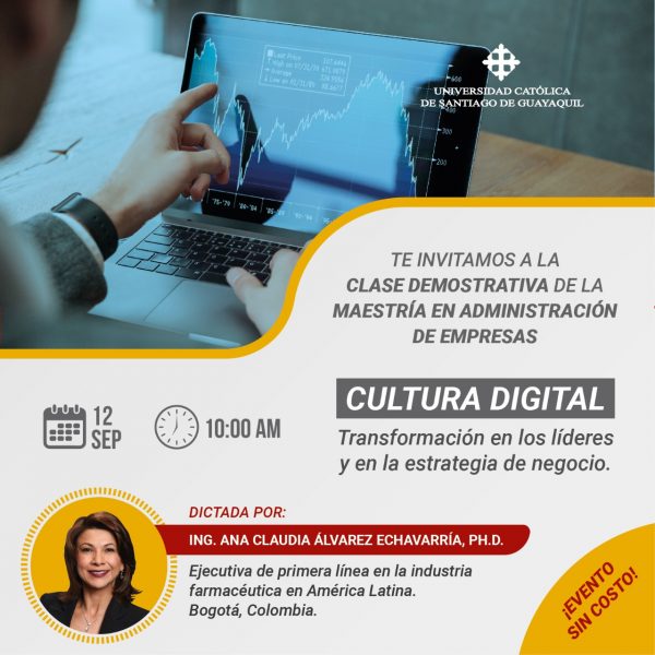 El sábado 12 de septiembre, a las 10h00, la Maestría en Administración de Empresas de la UCSG, ha preparado la conferencia: “Cultura Digital, transformación en los líderes y en la estrategia de negocio”, dictada por la Ing. Ana Claudia Álvarez Echavarría, ejecutiva de primera línea en la industria farmacéutica en América Latina.