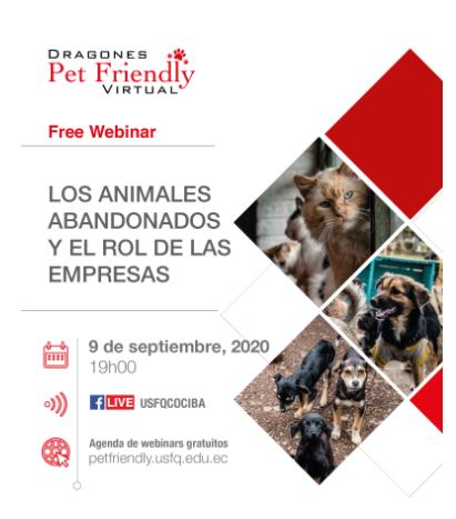 Este miércoles 9 de septiembre, a las 19h00, presentan el webinar gratuito: Los animales abandonados y el rol de las empresas. Este evento tendrá la participación de Lorena Hurtado, presidenta de la Fundación Revida, se lo transmitirá a través de Facebook Live de @USFQCOCIBA