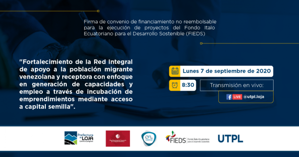 Este lunes 7 de septiembre, a las 08:30, la Universidad Técnica Particular de Loja firmará el convenio con el Fondo Ítalo – Ecuatoriano para el Desarrollo Sostenible (FIEDS), el cual permitirá contribuir al mejoramiento de la convivencia e inserción económica de la población en movilidad humana venezolana y de la población receptora del cantón Loja.