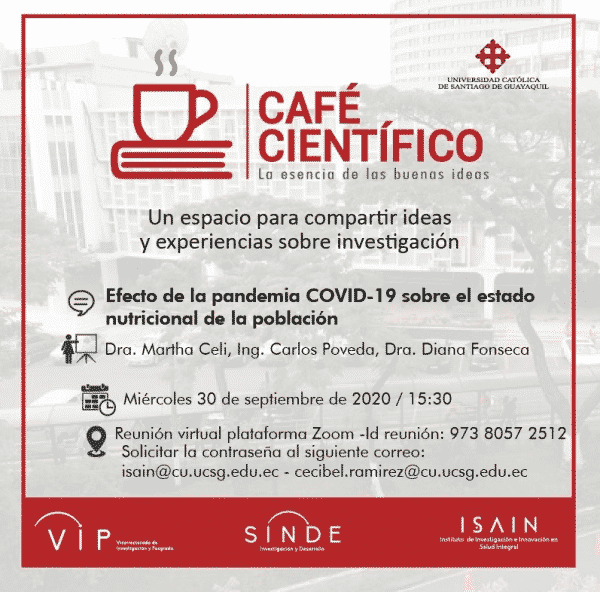 La Universidad Católica de Santiago de Guayaquil, en su espacio Café Científico UCSG organiza una conferencia sobre el efecto de la pandemia Covid-19 sobre el estado nutricional de la población.