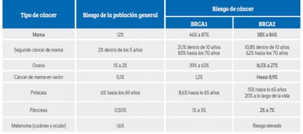 El riesgo acumulado para los 70 años de desarrollar cáncer de seno u ovario es de 59% y 60% para BRCA1 y de 16,5 a 55% para BRCA2 respectivamente. El riesgo de desarrollo de cáncer contralateral en la población diagnosticada con cáncer unilateral para los 70 años es 83% para portadores BRCA1 y 62% para BRCA2. Los individuos con cáncer de mama y ovario tienen una probabilidad de 86% de ser portadores de una mutación de los genes BRCA.