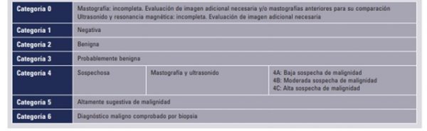 Es un método para clasificar los hallazgos mamográficos que actualmente se considera el diagnóstico de la patología mamaria. Permite estandarizar la terminología y el informe mamográfico, y categorizar las lesiones estableciendo el grado de sospecha y asignar la actitud a tomar en cada caso.