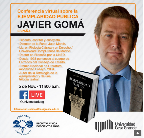 Javier Gomá, integrante del Cuerpo de Letrados del Consejo del Estado, Presidente de la Fundación March y acreedor en varios premios literarios, dictará una conferencia sobre Ejemplaridad Pública el jueves 5 de noviembre a las 11:00, que será transmitida en la cuenta de Facebook de la UCG (@universidaducg).