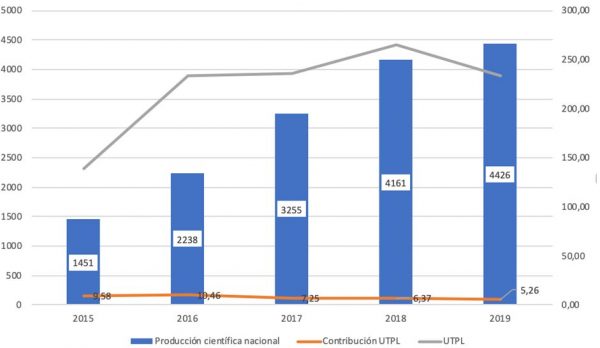 En Ecuador, de acuerdo con la Secretaría de Educación Superior, Ciencia, Tecnología e Innovación SENESCYT, en la actualidad existen 59 instituciones de educación superior y escuelas politécnicas que financian investigaciones para beneficio de la sociedad. En este entorno, la Universidad Técnica Particular de Loja UTPL, desde el sur del país, aporta significativamente a la producción científica, es así que entre los años 2015 a 2019, la ubicaron en el quinto lugar a nivel nacional con 1094 publicaciones indexadas en Scopus y en el 2019 se registraron 233 publicaciones científicas.