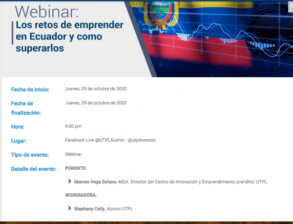 Un nuevo Webinar para emprendedores. Al momento de iniciar con un proyecto de emprendimiento, es importante considerar todos los aspectos que influyen en su desarrollo; desde la importancia de tener un plan y ser organizado con las obligaciones que el emprendimiento representa, hasta los retos a los cuales se deben de enfrentar cada uno. Por esta razón la UTPL lo invita, este jueves 29 de octubre a las 18:00, a ser parte del Webinar LOS RETOS DE EMPRENDER EN ECUADOR Y CÓMO SUPERARLOS.
