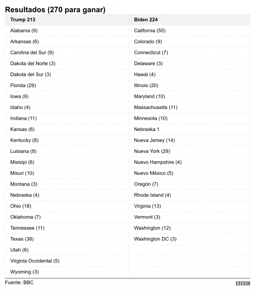 Las proyecciones de resultados muestran a Trump y Biden en una ajustada carrera para hacerse con los 270 delegados en el Colegio Electoral que necesitan para ganar la presidencia.