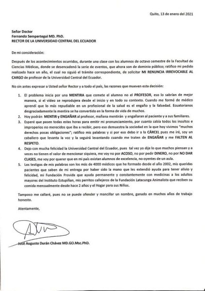 Poco tiempo después del comunicado de la Universidad Central, el docente anunció, a través de cuenta en Facebook, que había renunciado “irrevocablemente” a su cargo. “El tiempo me dará la razón”, posteó en Facebook junto a la renuncia presentada al centro de estudios.