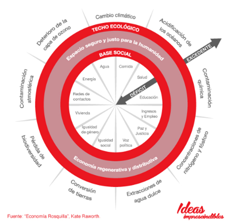 Raworth argumenta que “nuestra actividad económica debería desarrollarse en el espacio situado entre una base social y un techo ecológico. En la práctica, esto significa que todo el mundo debe tener acceso a los bienes básicos —comida, vivienda y salud— pero dentro de los medios y recursos disponibles en el planeta. Normalmente hablamos de redistribución de riqueza que ya se encuentra en manos de un grupo pequeño de personas. Esa es la esencia del modelo económico del siglo XX: redistribución de ingresos a posteriori por medio de impuestos progresivos y otros mecanismos. El concepto distributivo del siglo XXI consiste en diseñar nuestras actividades de tal forma que el valor se comparta desde el principio, en vez de redistribuir después. Y no hablo solo de dinero, sino también de tierras, empresas y medios para generar ingresos. ¿Qué va a ocurrir con la propiedad de la tecnología, quiénes serán los propietarios de nuestros robots? ¿Qué hacemos con nuestros conocimientos? ¿No tendría sentido que las ideas innovadoras procedentes de investigación financiada con fondos públicos fueran accesibles para todo el mundo? La esencia del reto, por tanto, consiste en reinventar la forma en que creamos valor en nuestra economía para compartirlo desde el principio.”