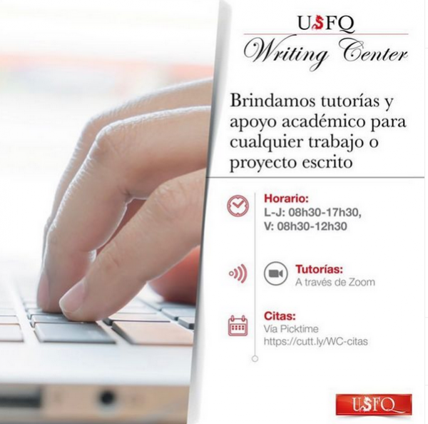 El @usfqwritingcenter está a disposición de todos los alumnos de la USFQ, brindando tutorías y apoyo académico en sus proyectos escritos tanto en español como en inglés en cualquier materia de la universidad. También se ofrece ayuda con documentos profesionales, como cartas de presentación y hojas de vida.