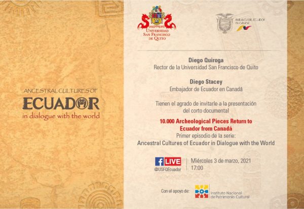 La Universidad San Francisco de Quito (USFQ) a través de su Colegio de Ciencias Sociales y Humanidades (COCISOH), presentará el corto documental 10,000 Piezas Arqueológicas Regresan a Ecuador desde Canadá, primer episodio de la serie Culturas Ancestrales del Ecuador en Diálogo con el Mundo, una co-producción con apoyo de la Embajada del Ecuador en Canadá.