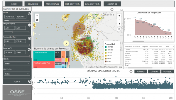 La plataforma está compuesta por más de 13 mil eventos sísmicos, que se registraron a lo largo de 120 años, correspondiente al periodo 1901-2021, la información está relacionada a: fecha, hora, región, ubicación, profundidad focal, etc. Estos datos pueden ser gestionados y visualizados de forma sencilla y rápida mediante la generación de mapas con datos asociados, gráficos de barras e histogramas. Para acceder a la plataforma el usuario puede ingresar desde el enlace vinculacion.utpl.edu.ec/es/observatorios/osse