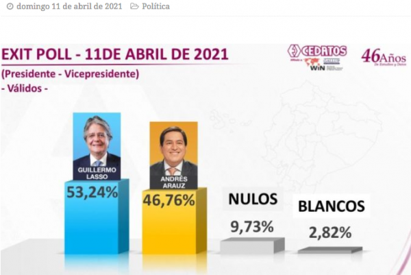 Cerradas las urnas en Ecuador, los resultados no oficiales de acuerdo a las encuestas a boca de urna (Exit Poll) de la empresa Cedatos sitúan al candidato presidencial Guillermo Lasso (CREO-PSC) con el 53,24 % de respaldo ciudadano mientras que Andrés Arauz cuenta con el 46,76% de apoyo de los ecuatorianos.