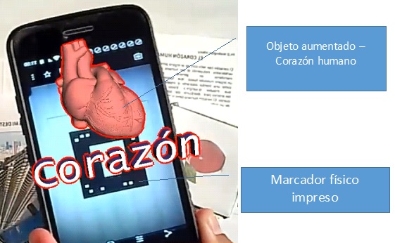 Fig. 1. Escaneo con el móvil sobre el marcador físico que muestra el corazón humano en 3D con Realidad aumentada en el dispositivo (WVILLOTA, 2021)