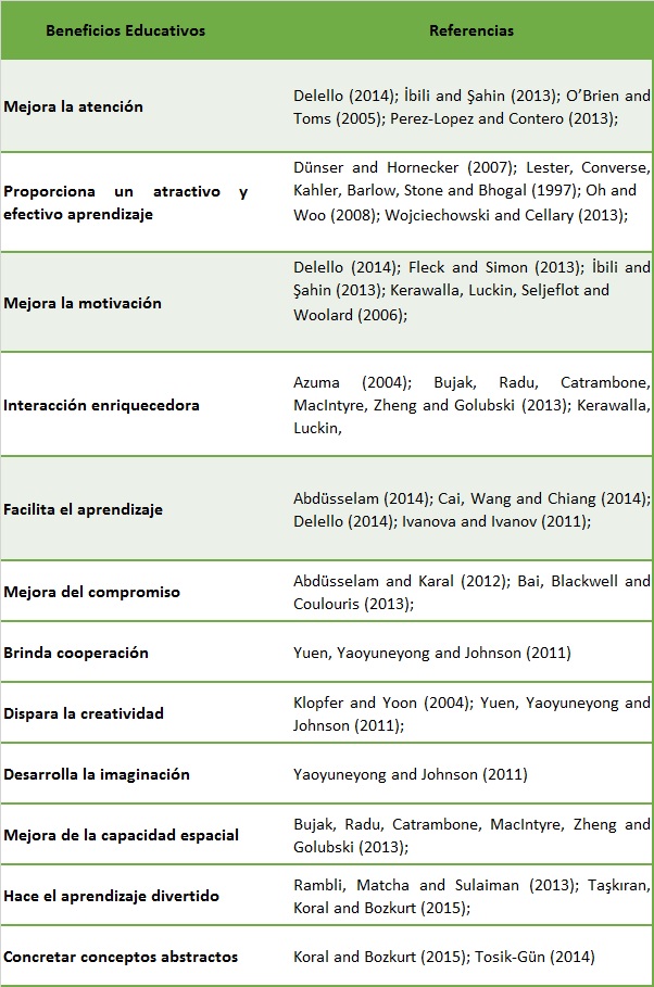 La RA podría permitir (1) aprender contenido en perspectivas 3D; (2) aprendizaje ubicuo, colaborativo y situado; (3) los sentidos de presencia, inmediatez e inmersión de los alumnos; (4) visualizar lo invisible; y (5) tender puentes entre el aprendizaje formal e informal (Wu, Lee, Chang y Liang, 2016).