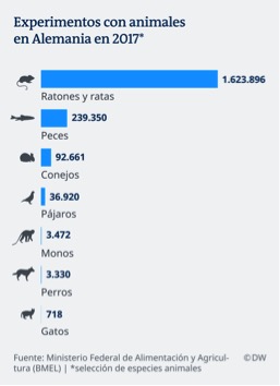 Según datos de investigación realizado por el Ministerio de Alimentación de Alemania en el año 2017 el mayor porcentaje de animales usados para realizar pruebas o testeo de productos cosméticos y medicina son las ratas, ratones, siguiendo en porcentaje el uso de peces, conejos, cobayos, pájaros, aves de corral, cerdos, monos, perros, gatos.