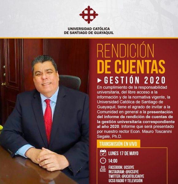 Como parte de los eventos programados para celebrar su aniversario y en cumplimiento de la responsabilidad universitaria, del libre acceso a la información y de la normativa vigente, la UCSG, invita a la comunidad en general a la presentación del informe de rendición de cuentas de la gestión universitaria correspondiente al año 2020. Informe que será presentado por el rector Eco. Mauro Toscanini Segale, Ph.D. el evento se desarrollará a las 14:00 y será retransmitido por la redes sociales de la universidad.