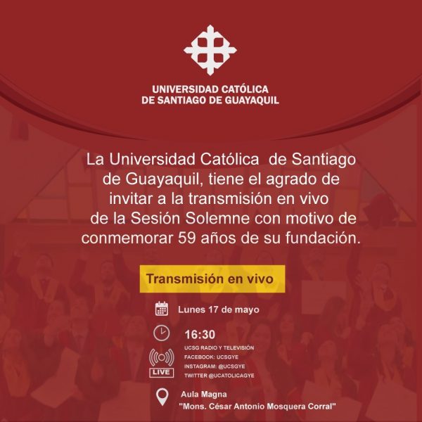 La Universidad Católica de Santiago de Guayaquil (UCSG), cumple este 17 de mayo de 2021, 59 años de vida institucional, y lo hace por segundo año consecutivo en medio de una crisis sanitaria originada por la pandemia, por ello todos quienes conforman la institución están orgullosos de lo que han logrado, pero están conscientes de que aún faltan cosas por hacer.