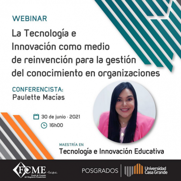 Webinar gratuito: “La Tecnología e Innovación como medio de reinvención para la gestión del conocimiento en organizaciones” Conferencista: Paulette Macías Fecha: 30 de junio, 2021 Hora: 16h00 Maestría en Tecnología Educativa Link de registro: https://bit.ly/La-tecnologia-