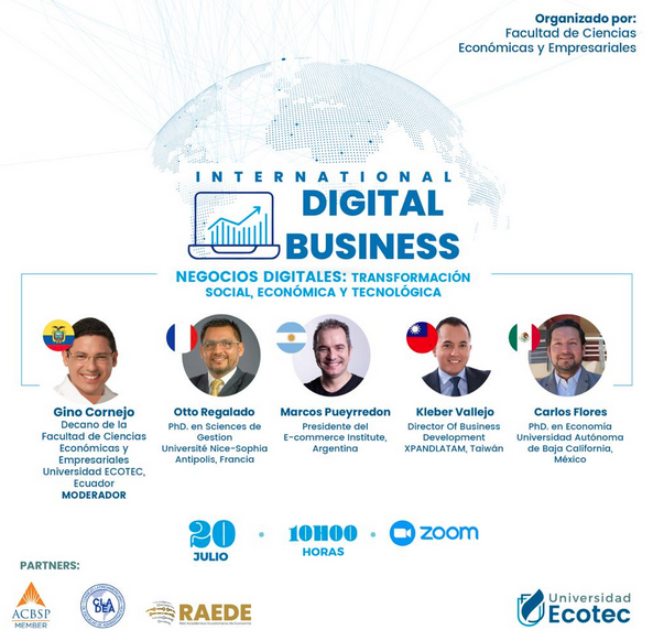 Entre los participantes se encuentran como moderador Gino Cornejo, Decano de la Facultad de Ciencias Económicas y Empresariales de la U. Ecotec; Otto Regalado, PhD en Sciences de Gestión; Marcos Pueyrredon, Presidente del E-commerce Institute Argentina; Kléver Vallejo, director of Business Development XPLANDATAM, Taiwán y Carlos Flores , PhD, en Economía, Universidad Autónoma de Baja California, México. El evento será este 20 de julio a las 10:00.