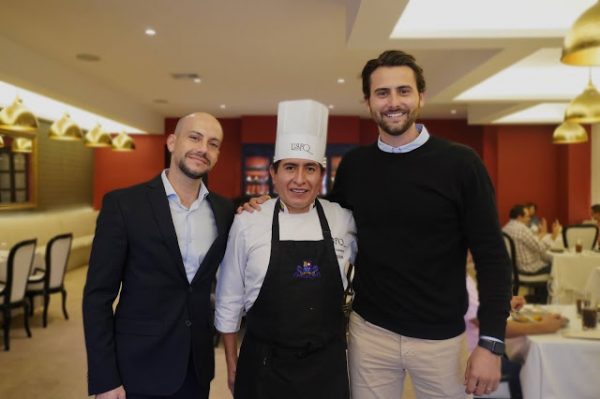 Damián Ramia, decano del Colegio de Hospitalidad, Arte Culinario y Turismo USFQ (izq.), chef Néstor Toapanta, y Niels Olsen (der.), Ministro de Turismo del Ecuador, en una visita al restaurante Marcus de la USFQ