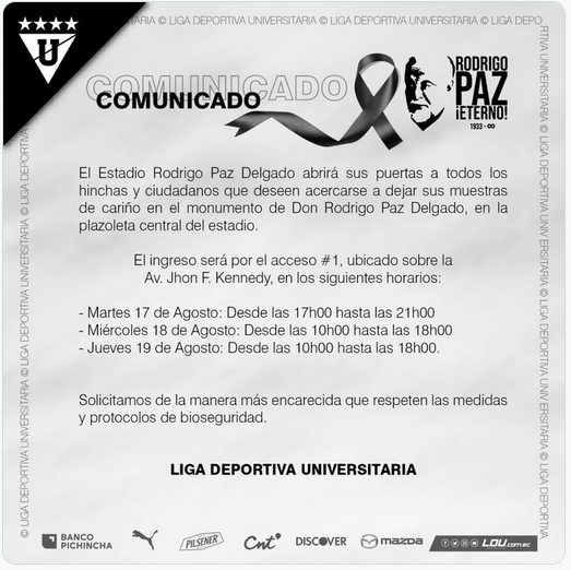 La directiva de Liga de Quito decidió abrir las puertas de su estadio, para que los aficionados puedan dejar sus muestras de cariño y respeto a Rodrigo Paz.