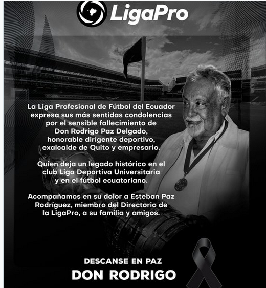“LigaPro realizará un minuto de silencio en todos los partidos de la LigaPro, series A y B desde hoy (17 de agosto), descanse en paz don Rodrigo”, publicó el organismo en un comunicado en el grupo de Whatsapp.