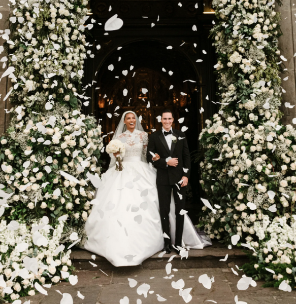 Jasmine supo desde el principio que su look nupcial sería de Zuhair Murad. “Quería que él me hiciera el vestido desde que desfilé por primera vez en su pasarela de costura”, dice. “Le envié mis ideas y él me dibujó el vestido más bonito y más atemporal que he visto en mi vida”. Frente a la cola de 4,5 metros y el dramatismo que desprendía todo el look, Jasmine redujo al mínimo las joyas, con solo unos pendientes de diamantes de Ritani y su anillo de compromiso. Calzó unos salones personalizados en satén blanco de Sarah Flint. Su look de belleza fue obra de Leah Pike y Russian Nureev, quienes la peinan y la maquillan para casi todos los eventos. Juan vistió un esmoquin de doble botonadura de Armani. “Ambos quisimos que nuestros looks fueran clásicos y tradicionales al máximo”, cuenta la novia.