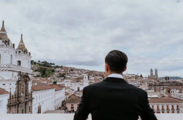 La ceremonia tuvo lugar el sábado en una iglesia católica en el corazón de Quito. “Para mí Quito tiene algunas de las iglesias más bonitas del mundo”, dice Jasmine. “Y la que elegimos nosotros está toda cubierta de oro, fue casi como asistir a una boda real”. La hermana de la novia, Chloe, fue la niña de las flores y Roguey, su bulldog francés, llevó los anillos al altar.