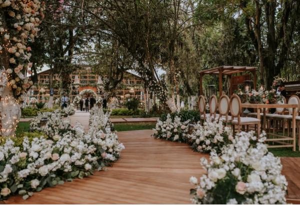 Tras la ceremonia, los invitados se congregaron en una hacienda situada a 30 minutos de Quito, enclave de la bucólica recepción. “La diseñamos en Ecuador, con Lorena de Fialo Eventi”, explica Jasmine. “Enseguida entendió lo que quería. Imagínate un jardín encantado con más flores de las que hayas visto nunca. Todo fue muy romántico, a la luz de las velas, y con un violinista increíble tocando. Era más o menos como un invernadero gigante, colgaban flores del techo y todo. Como si los invitados estuviesen sentados a la mesa en su propio jardín”.