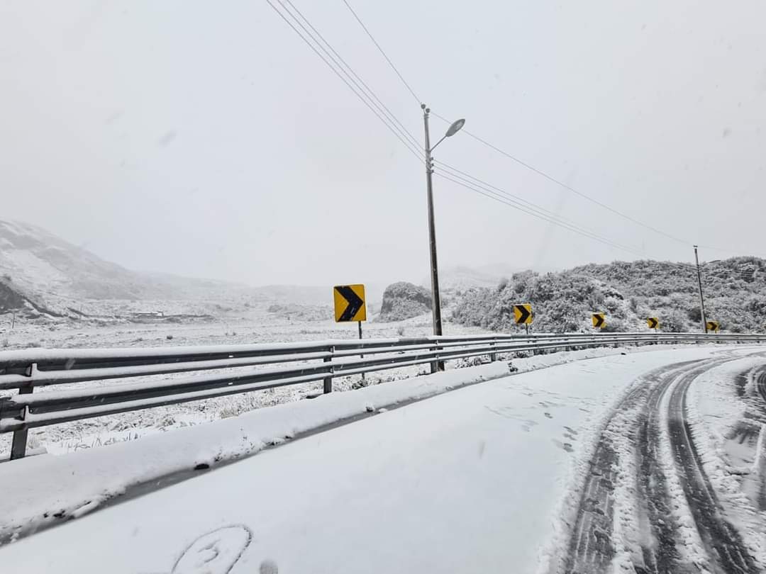 En redes sociales la Policía Nacional, compartió algunas fotografías en donde se observa que una densa capa de nieve cubrió los sectores afectados. Los automotores quedaron detenidos en medio del hielo.