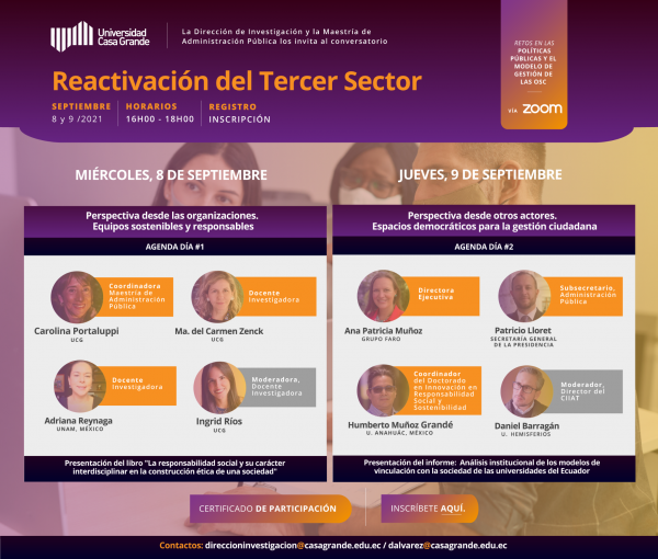 La Dirección de Investigación y la Maestría de Administración Pública de la Universidad Casa Grande los invita al evento denominado “REACTIVACIÓN DEL TERCER SECTOR: Retos en las políticas públicas y el modelo de gestión de las OSC”. Nuestros expertos y panelistas de Ecuador y México, compartirán sus experiencias y visiones para neutralizar los efectos de la pandemia abordados con un enfoque sistémico desde las organizaciones, desarrollando estrategias para lograr equipos sostenibles en el contexto actual; y desde la perspectiva de otros actores que se vinculan con las OSC como espacios democráticos para la gestión ciudadana y la innovación en la acción colectiva.