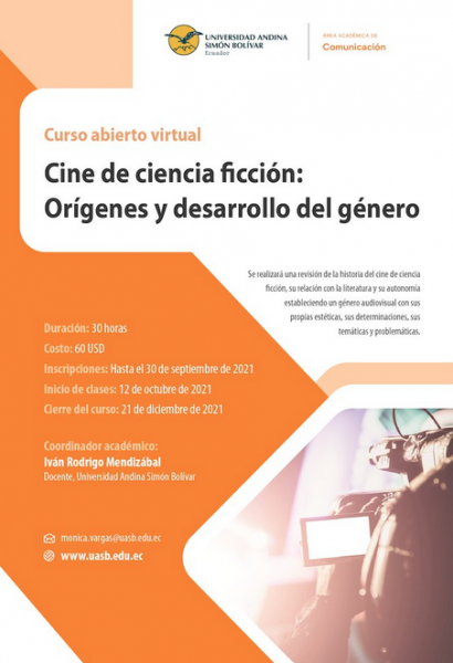 Un nuevo curso abierto que organiza el @ComunicaUASB de la @uasbecuador: “Cine de ciencia ficción: orígenes y desarrollo del género” > Se realizará una revcisión de la historia del cine de ciencia ficción, su relación con la literatura y su autonomía estableciendo un género audiovisual con sus propias estéticas, sus determinaciones, sus temáticas y problemáticas