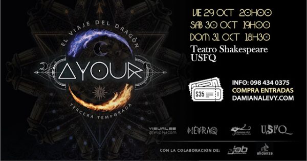 En esta nueva edición la USFQ abre sus puertas a proyectos artísticos innovadores: “Ayour. El Viaje del Dragón” se presentará en el Teatro William Shakespeare el viernes 29 de octubre a las 20h00, el sábado 30 de octubre a las 19h00, y el domingo 31 de octubre a las 18h30.