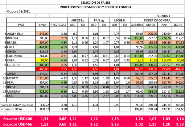 Los datos de las columnas décima, décima primera, décima segunda y décima tercera constituyen el centro del análisis. Nos muestran la capacidad de compra de cada país sobre la base del poder de compra del SMM y los precios vigentes a octubre 2021 en los diversos países incluidos en el cuadro estadístico, según la fuente de datos señalada para esos los países.