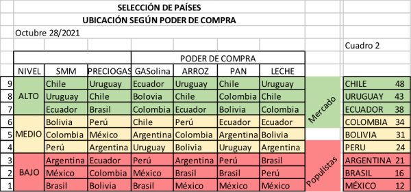 Una vez revisado el cuadro 2, concuerdo con Mariana Neira en su artículo mencionado antes, en que los países socialistas populistas (Perú, Argentina, Brasil, México) están en peor situación que los que buscan estabilidad, equilibrio y trabajo mediante la participación de la iniciativa privada en el mercado (Chile, Uruguay, Ecuador, Colombia) para un desarrollo sustentable.