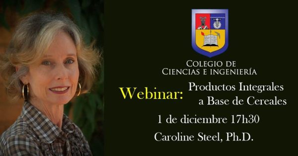 La USFQ realizará el miércoles 1 de diciembre él Webinar: Productos Integrales a base de Cereales. Esta charla se enfocará en los productos integrales con base en cereales desde el punto de vista tecnológico, microbiológico, de la salud y de la legislación. La conferencista Caroline Steel, Ph.D estará a cargo de  la actividad.