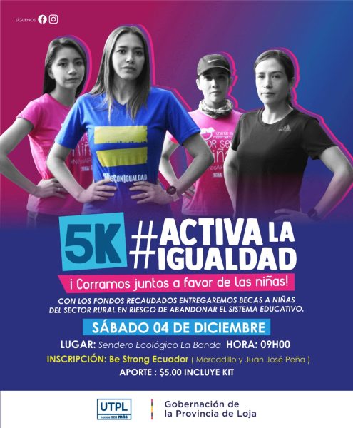 La Universidad Técnica Particular de Loja se siente orgullosa de ser el patrocinador oficial de la carrera 5K Activa la Igualdad con motivo de los 16 días de activismo para eliminar la violencia contra la mujer. Actividad que se realizará este 4 de diciembre. En garantía del derecho a la educación de niñas y mujeres de los sectores rurales de la provincia de Loja. Inscripción la puedes hacer en Be Strong Ecuador  (Mercadillo entre Juan José Peña y Olmedo) o a través de este link