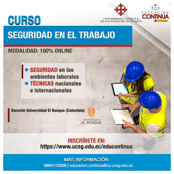 La Universidad Católica de Santiago de Guayaquil pone en marcha el curso en seguridad en el Trabajo, en el que aprenderás técnicas nacionales e internacionales actualizadas en el tiempo, encaminados a prevenir riesgos ocupacionales. Si estás interesado apúntate es el momento de aprender, ingresa a link: bit.ly/3CbbbMH o llama al 0994110309