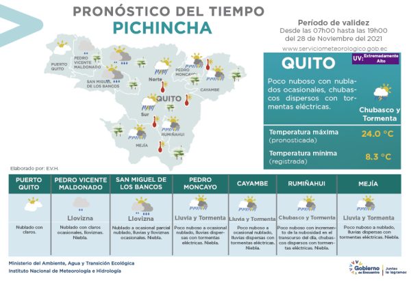 El Instituto Nacional de Meteorología e Hidrología (INAMHI) indicó que para esta semana el cielo de Quito estará parcialmente nublado con ráfagas ocasionales de viento moderado. La temperatura mínima será de 8 °C y la máxima será de 23 °C.