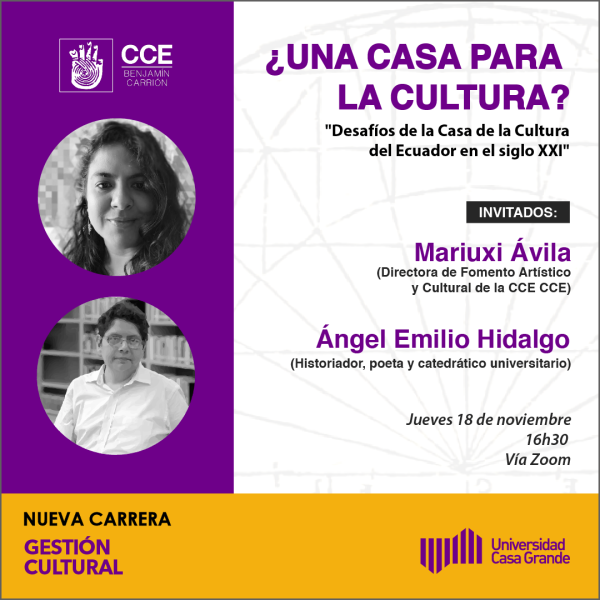 La nueva carrera de Gestión Cultural de la UCG, invita al conversatorio “¿Una casa para la cultura? Desafíos de la Casa de la Cultura del Ecuador del siglo XXl”. La actividad se dará este jueves 18 de noviembre a las 16:30, vía zoom.