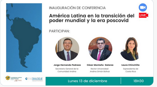 El Secretario General de la @ComunidadAndina, @JHPedraza; la expresidenta de Costa Rica, @Laura_Ch; y, nuestro rector @cesarmontanog, inaugurarán la conferencia América Latina en la transición del poder mundial y la era poscovid.