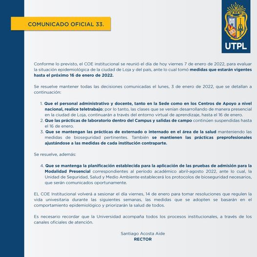 La UTPL emitió un comunicado institucional para ratificar las medidas vigentes aprobadas por el COE Nacional en lo que se refiere a la situación epidemiológica de Loja y el país.