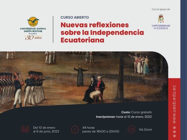 La universidad Andina Simón Bolívar ofrece el curso abierto gratuito “Nuevas reflexiones sobre la Independencia ecuatoriana”, para conmemorar desde un punto de vista académico, el bicentenario de la Batalla del Pichincha y divulgar los avances y desarrollos que ha tenido la investigación histórica en torno a la comprensión de la Independencia. Las inscripciones son hasta el 12 de enero y tendrá una duración de 44 horas.